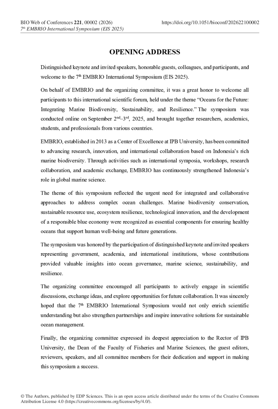 7th EMBRIO International Symposium: “Ocean for the Future: Integrating Marine Biodiversity, Sustainability, and Resilience” (EIS 2025)